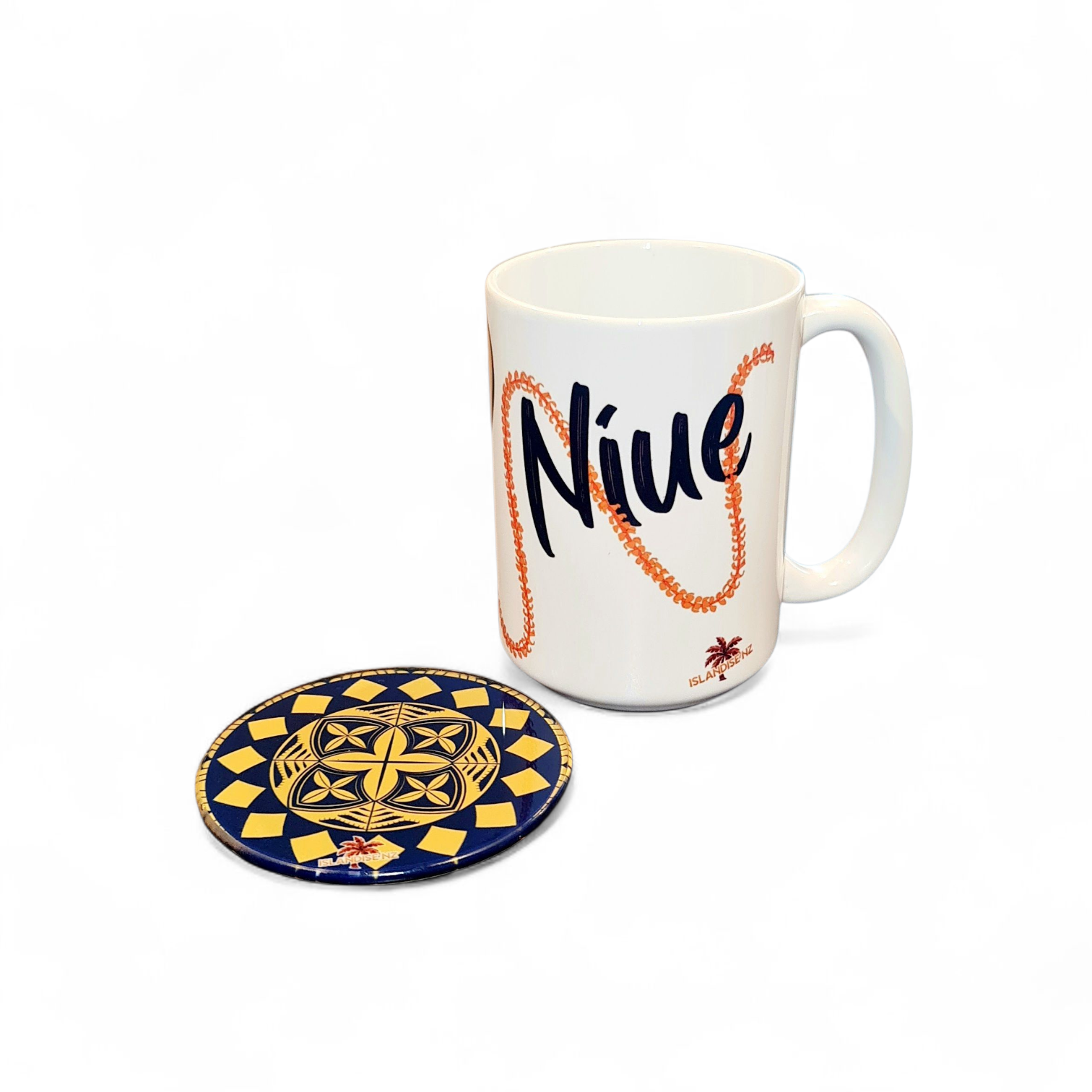 Acknowledge with style your deep connection to Niue with our very own 'I LOVE NIUE' paired set. Featuring a 440ml/15oz white ceramic mug and a matching heat-resistant glass coaster, each piece honours Niue heritage and pride.